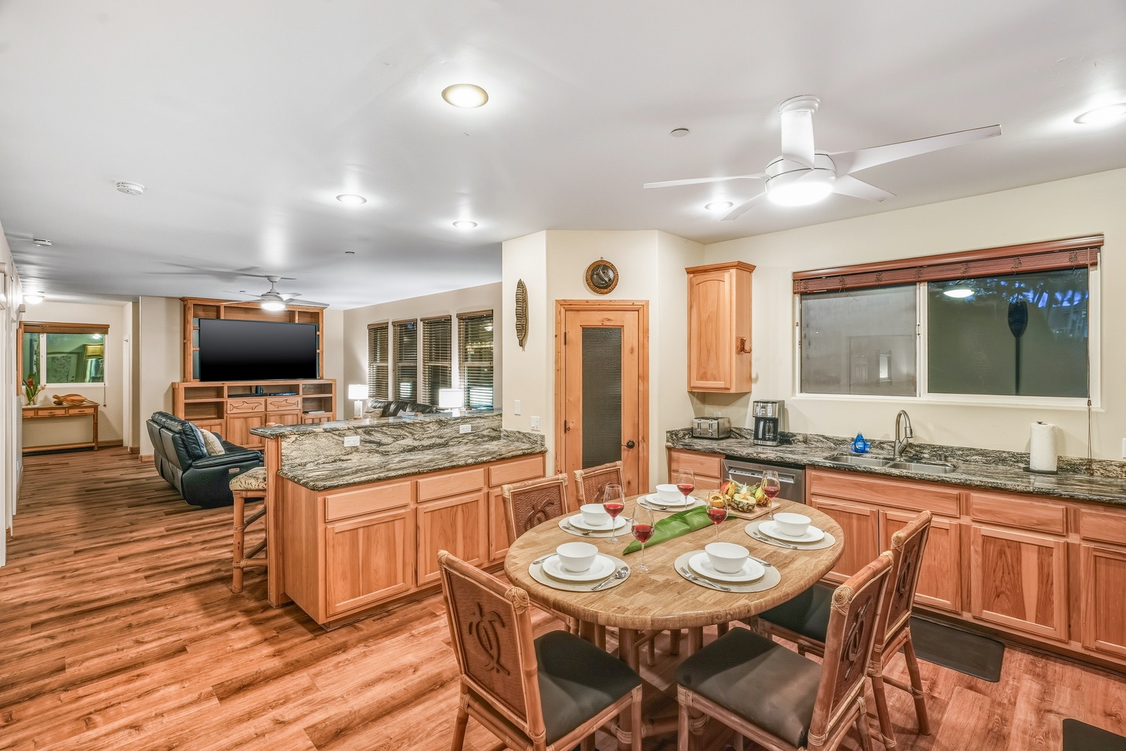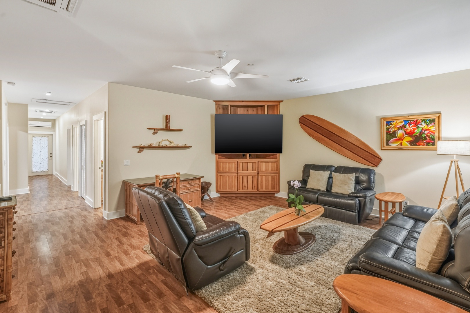 Spanning 3,000 square feet, the Turtle Suite makes up one half of the beloved Pane Makai Beach House duplex. Thoughtfully designed for large groups, the home features four bright bedrooms, two welcoming living areas, and a fully appointed kitchen with seating for twelve, creating the ideal setting for meals, connection, and relaxation.