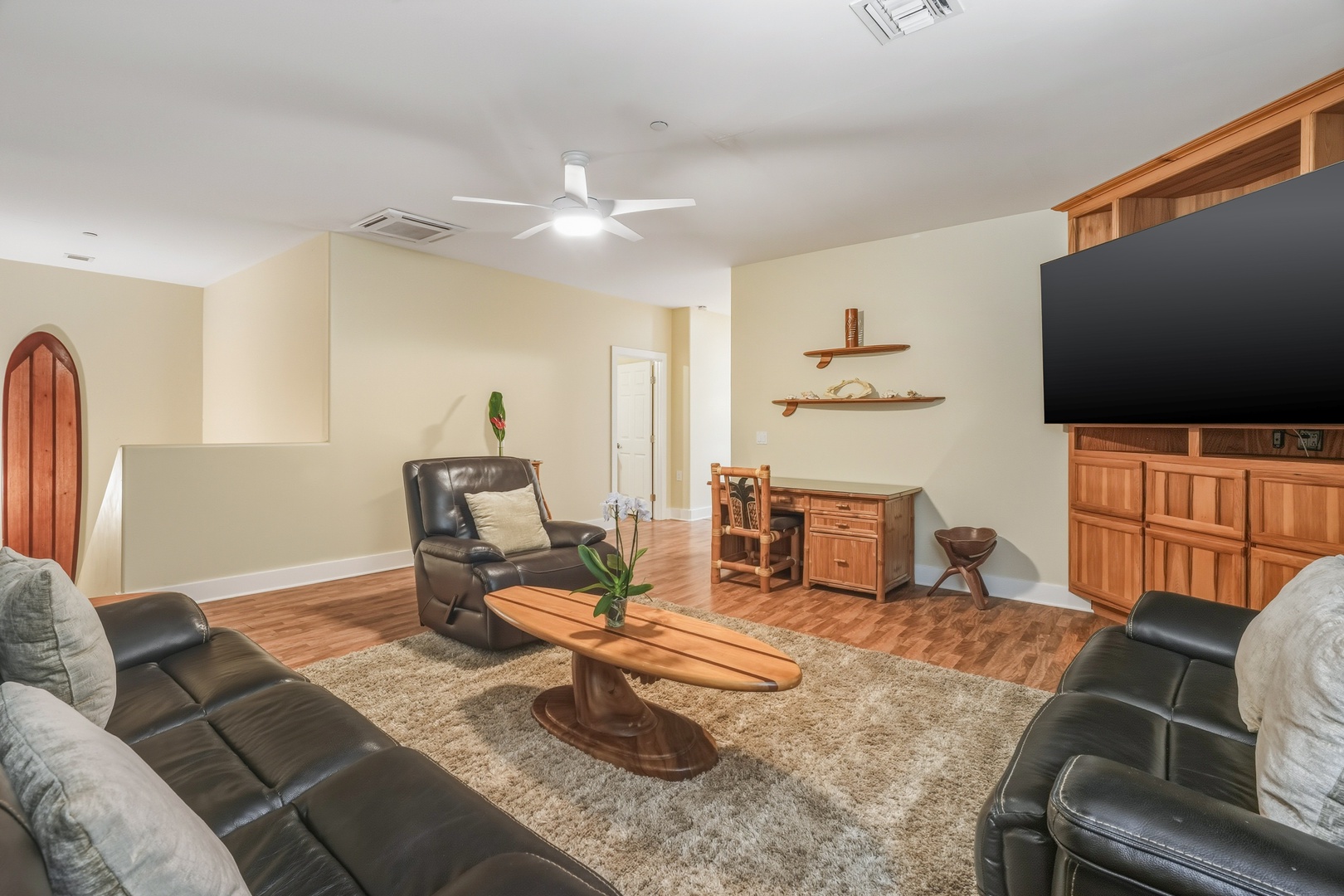 Cozy upstairs lounge with an 80” smart TV