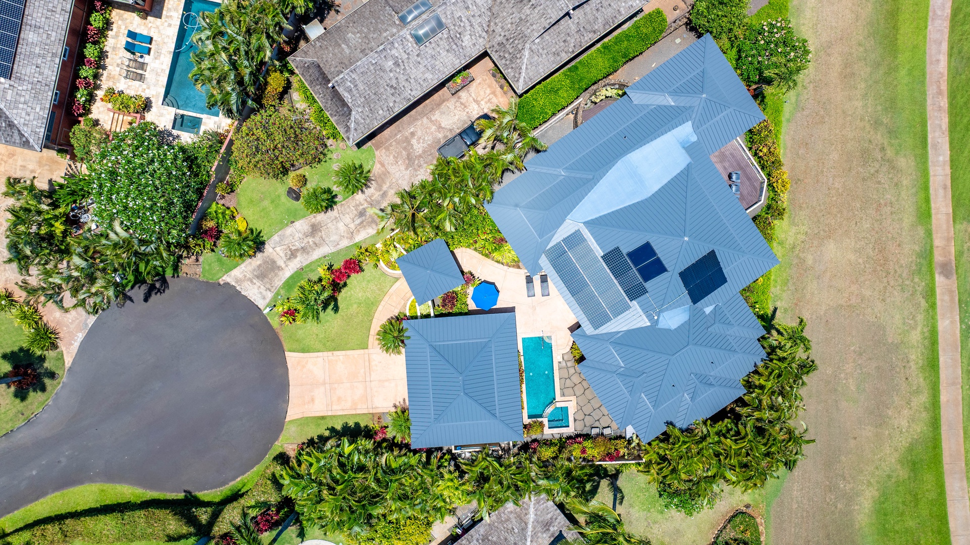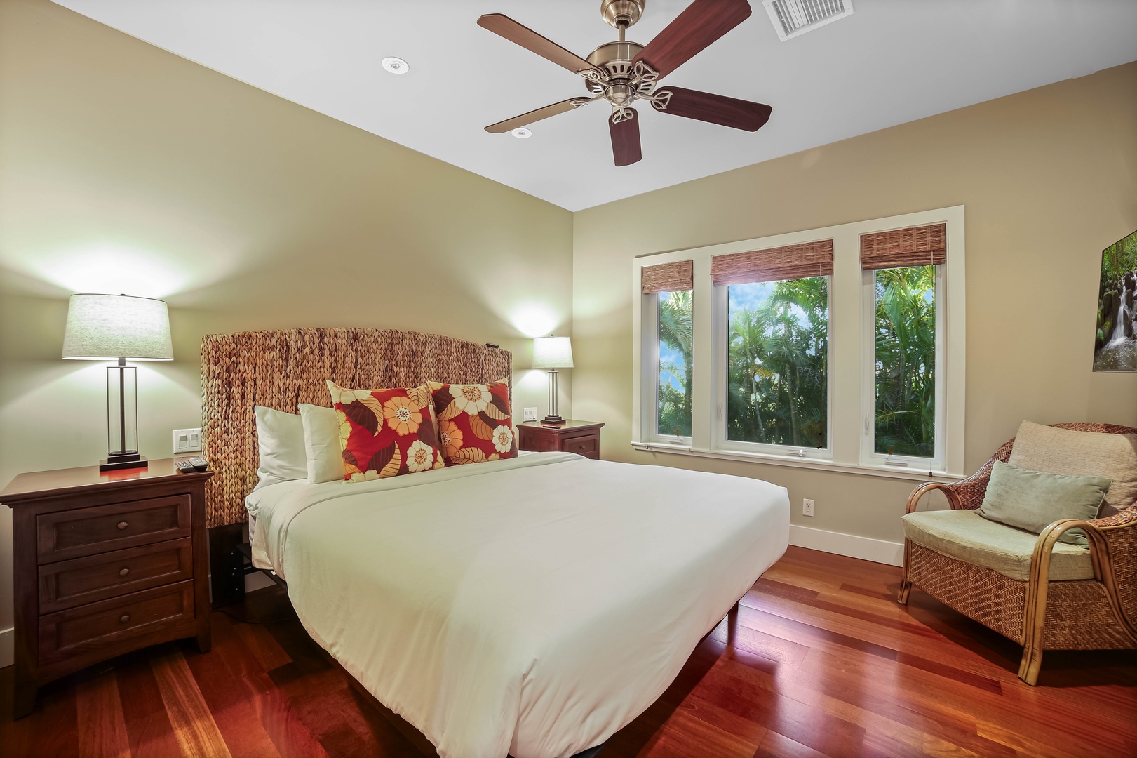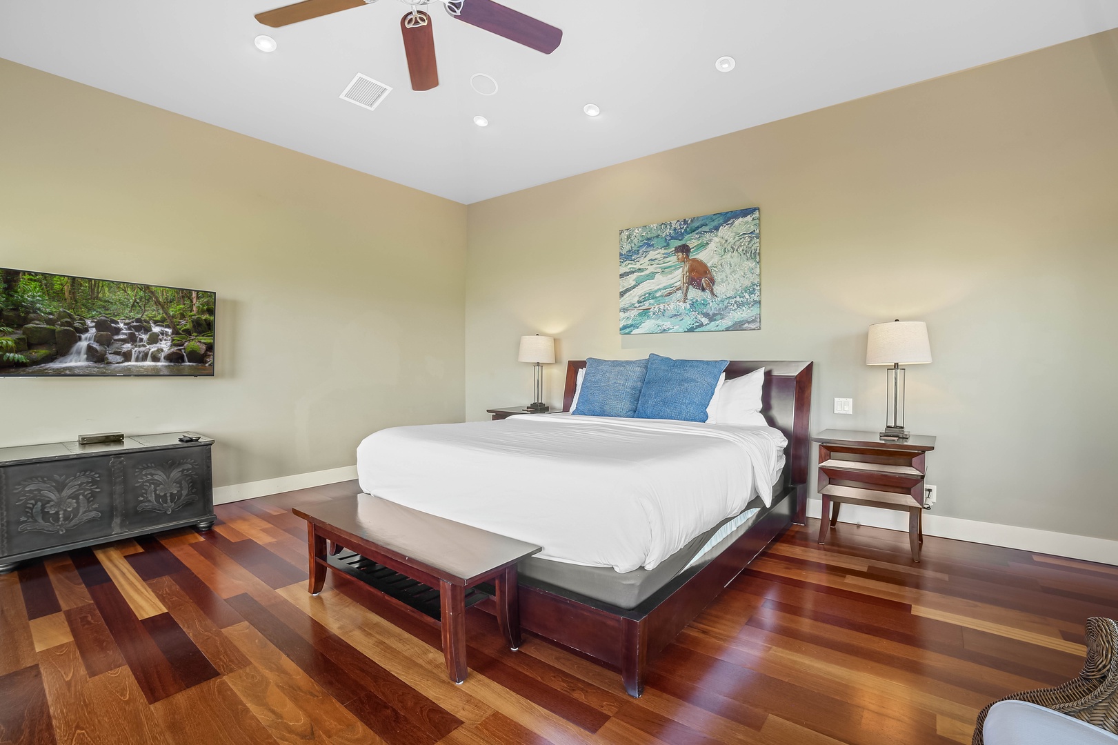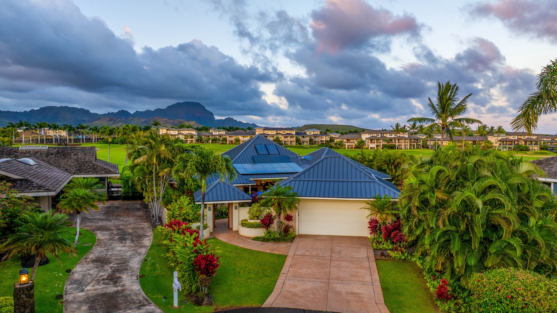 Named "Heavenly Breezes" for a reason, Poipu Makani Lani is a 4-bedroom, 3.5-bathroom custom home that is perfectly perched on the Kiahuna Golf Course's first hole. This modern single-level home offers three luxury master suites and a guest suite creating ultimate privacy for everyone. With Air Conditioning, a pool, a hot tub, a luxury kitchen, and an enclosed private lanai, Poipu Makani Lani is sure to enhance your Kaua’i experience.