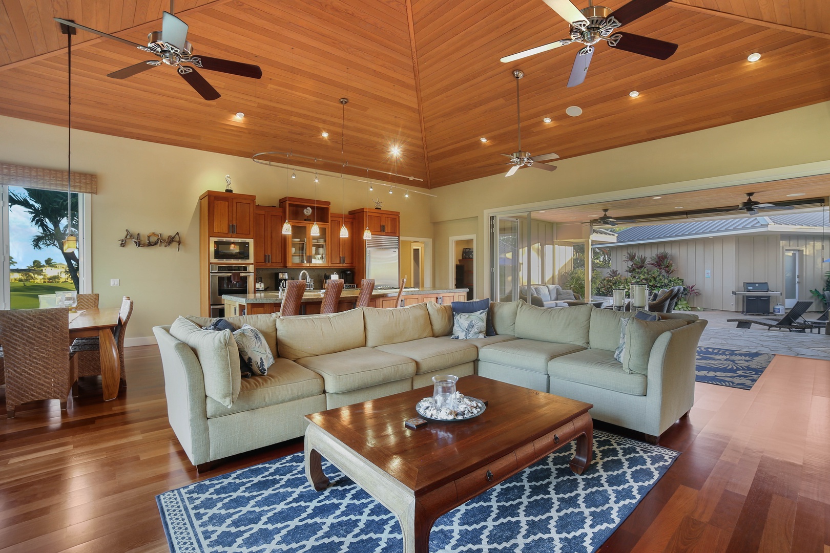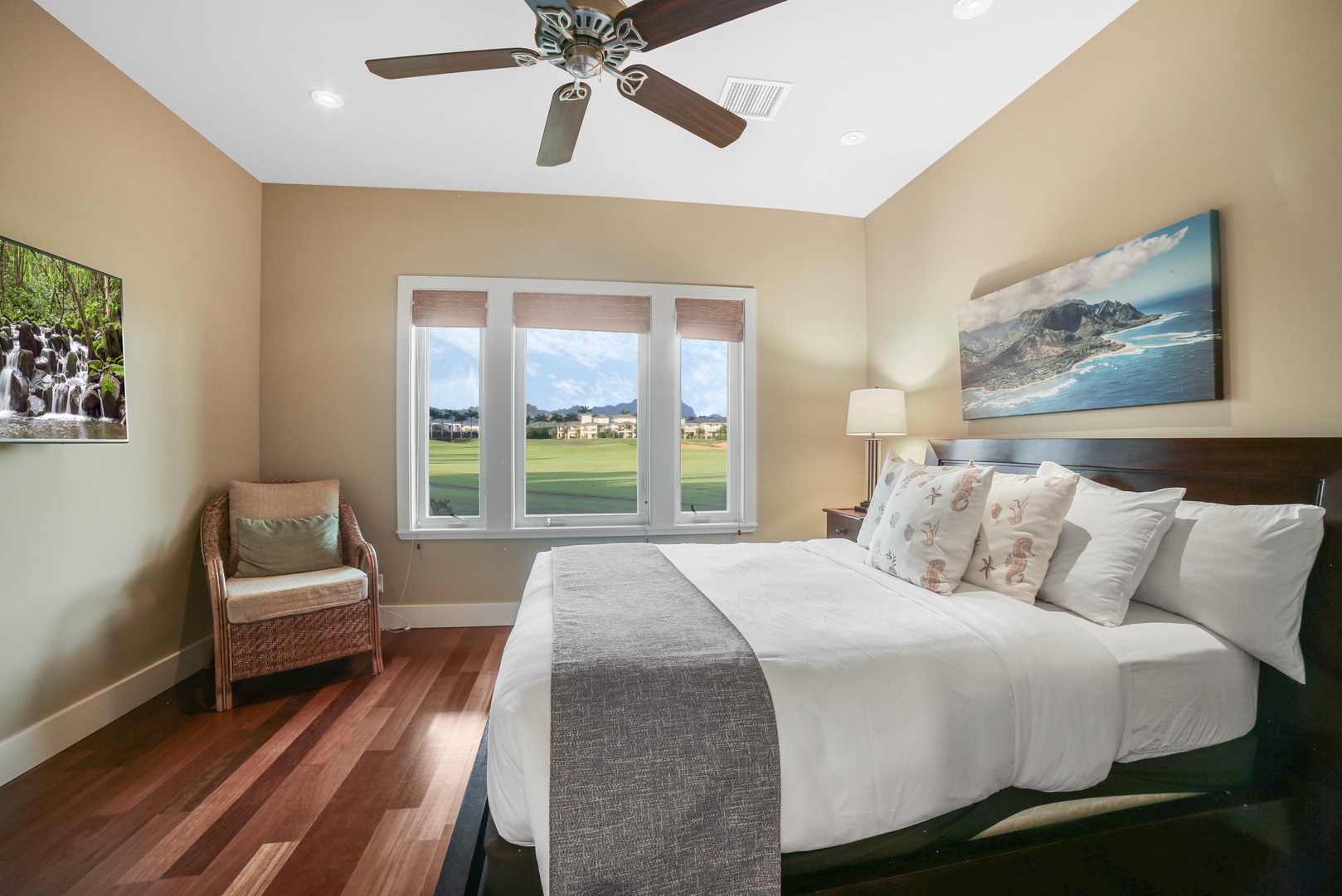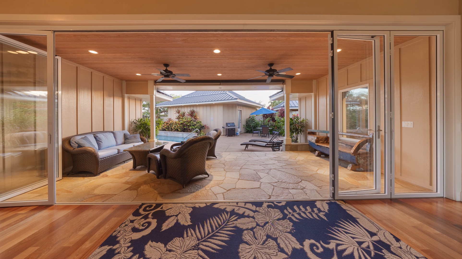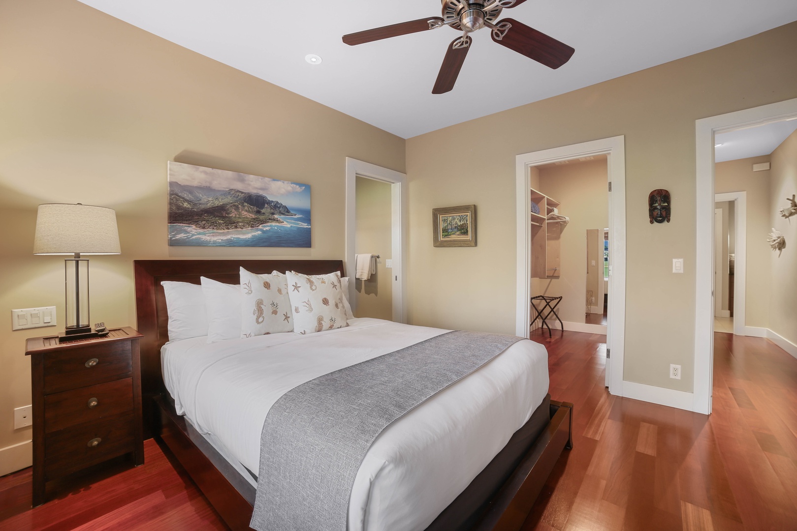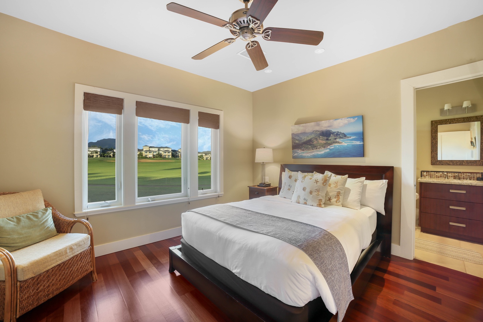 Named "Heavenly Breezes" for a reason, Poipu Makani Lani is a 4-bedroom, 3.5-bathroom custom home that is perfectly perched on the Kiahuna Golf Course's first hole. This modern single-level home offers three luxury master suites and a guest suite creating ultimate privacy for everyone. With Air Conditioning, a pool, a hot tub, a luxury kitchen, and an enclosed private lanai, Poipu Makani Lani is sure to enhance your Kaua’i experience.