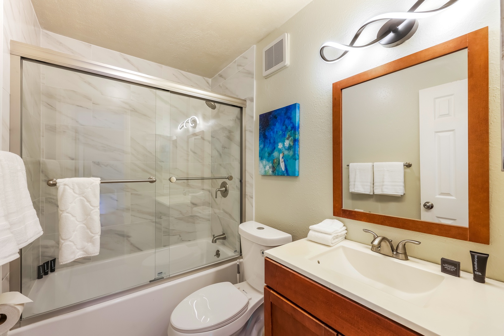 Fresh and functional- Hallway bathroom featuring tub/shower combo and bright, modern lighting