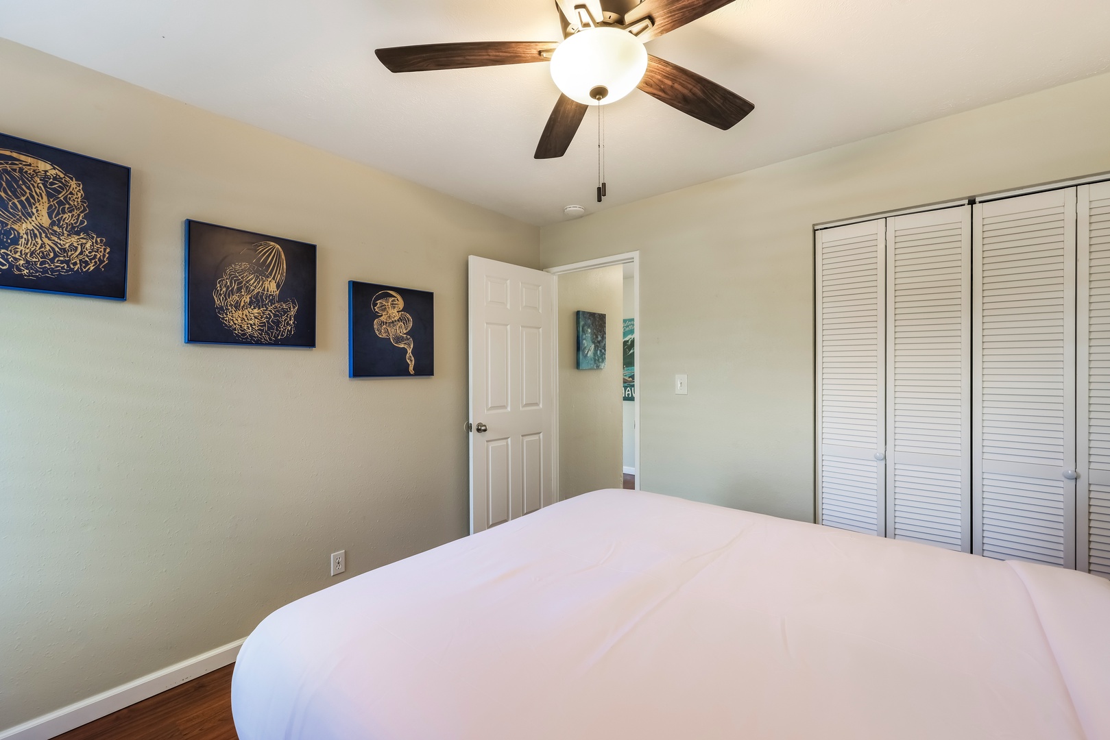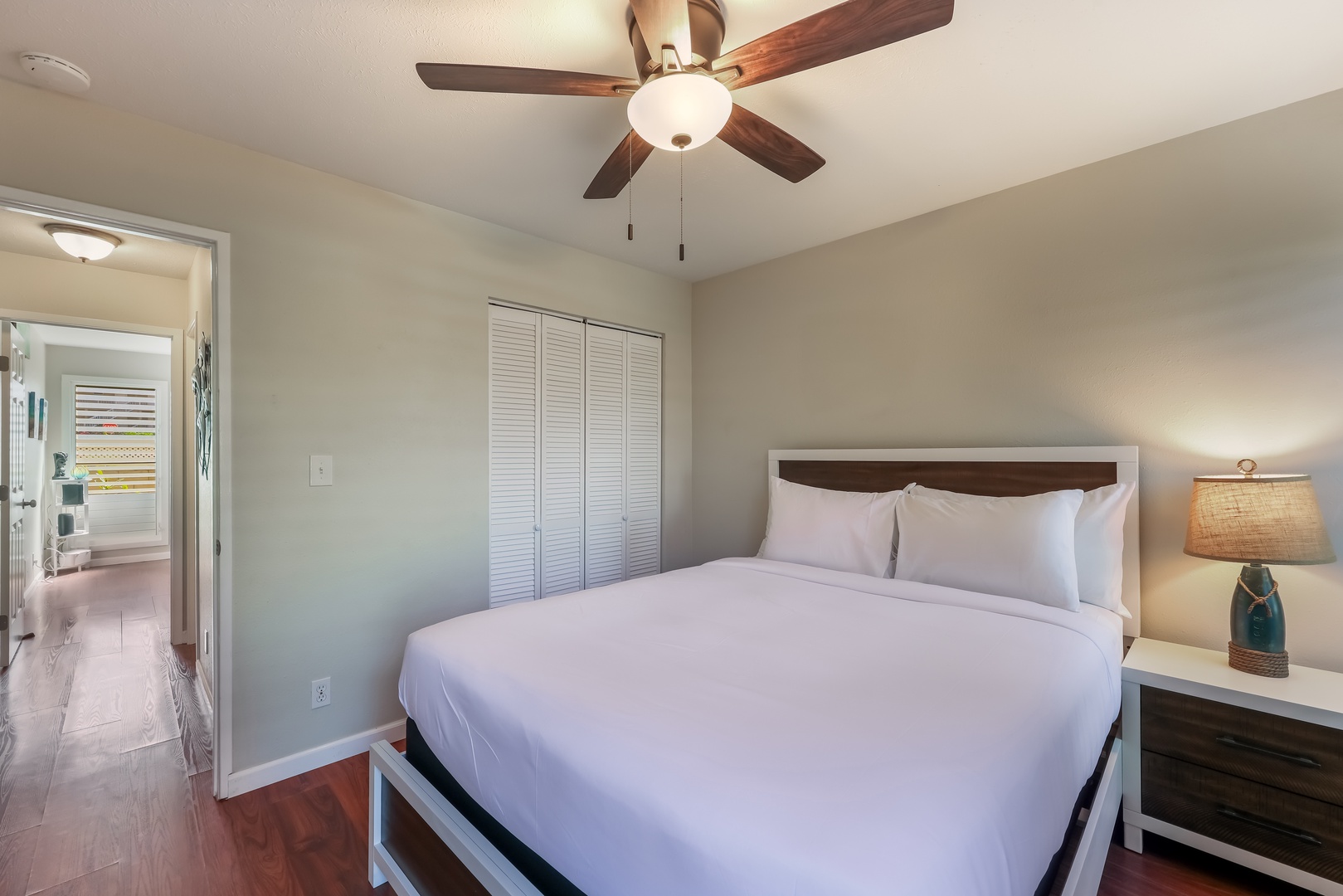 Second bedroom with ceiling fan and comfortable queen bed