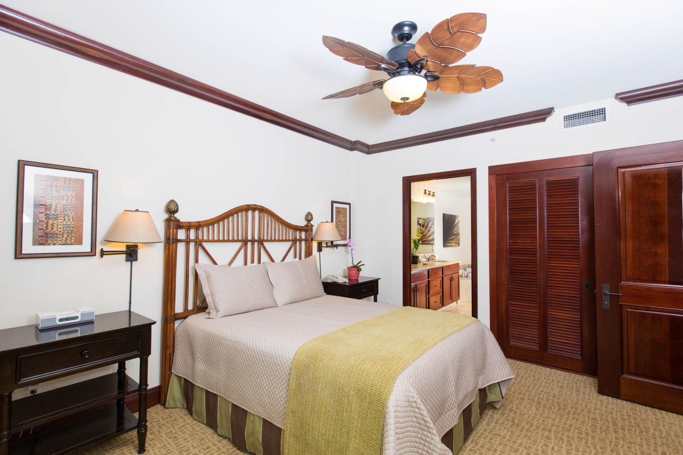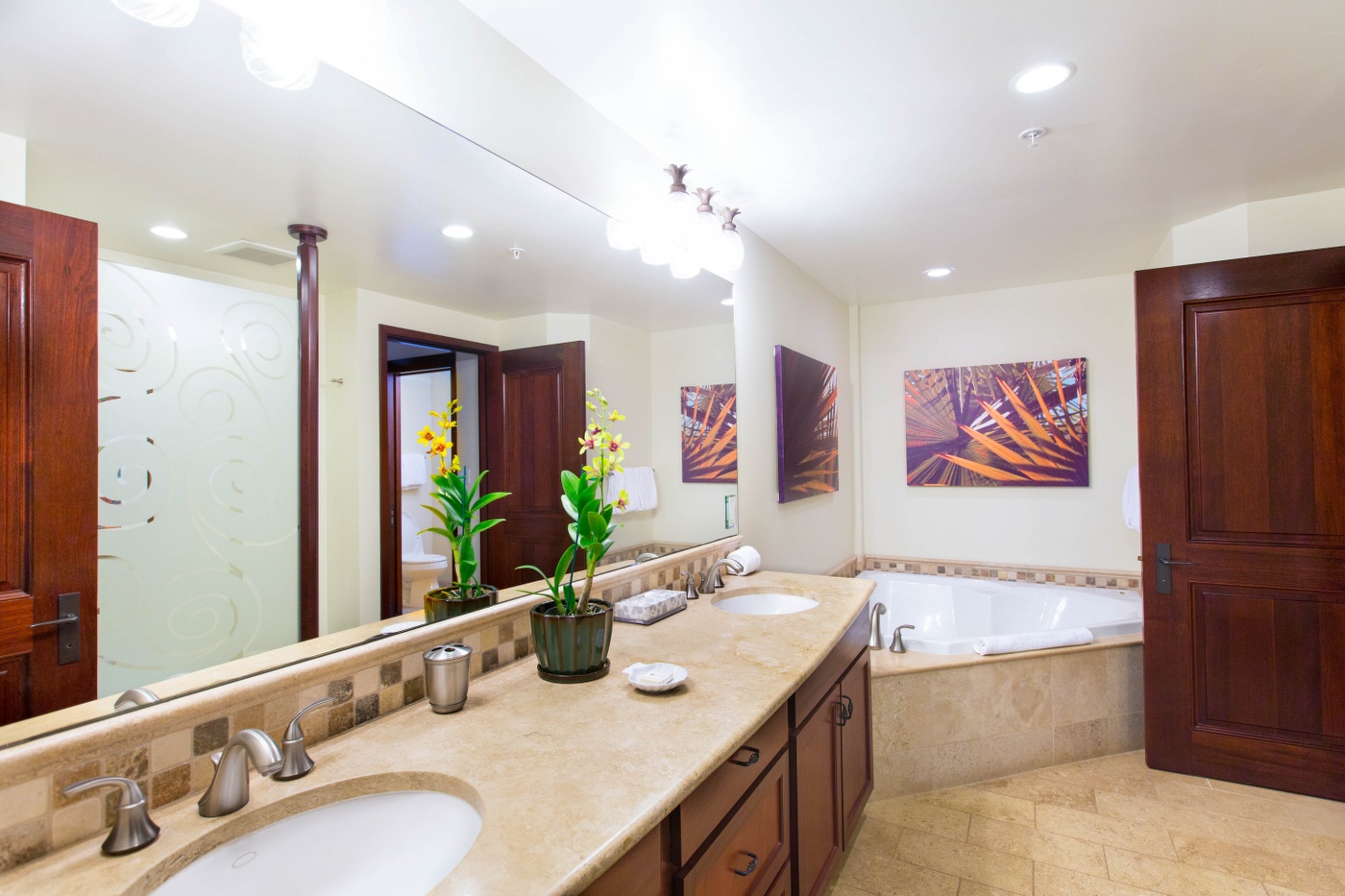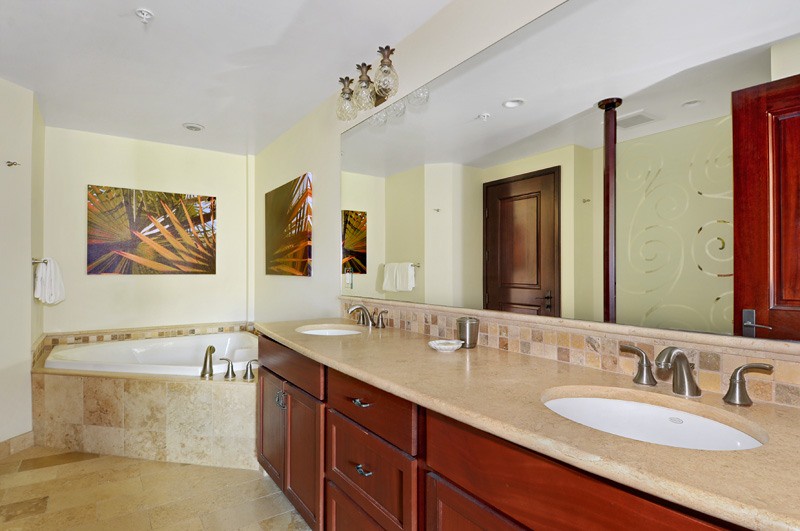 This recently upgraded two-bedroom, three-bath suite comfortably accommodates up to six people. The stylish interior includes a stately kitchen with a Wolf glass cook-top and oven, Sub-Zero refrigerator, granite counter tops, African Mahogany cabinets, along with three full bathrooms surrounded with Peruvian Travertine stone. Enjoy the clean design and convenient location, with the beach and countless Kaua’i adventures just outside your private lanai.