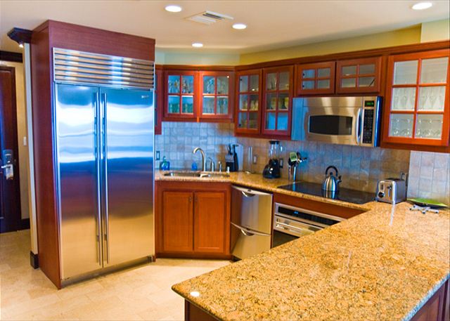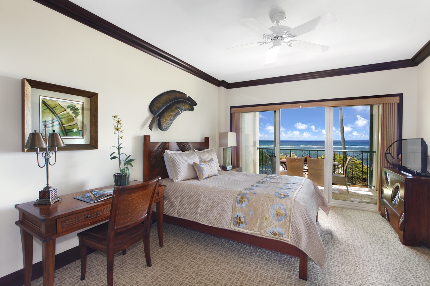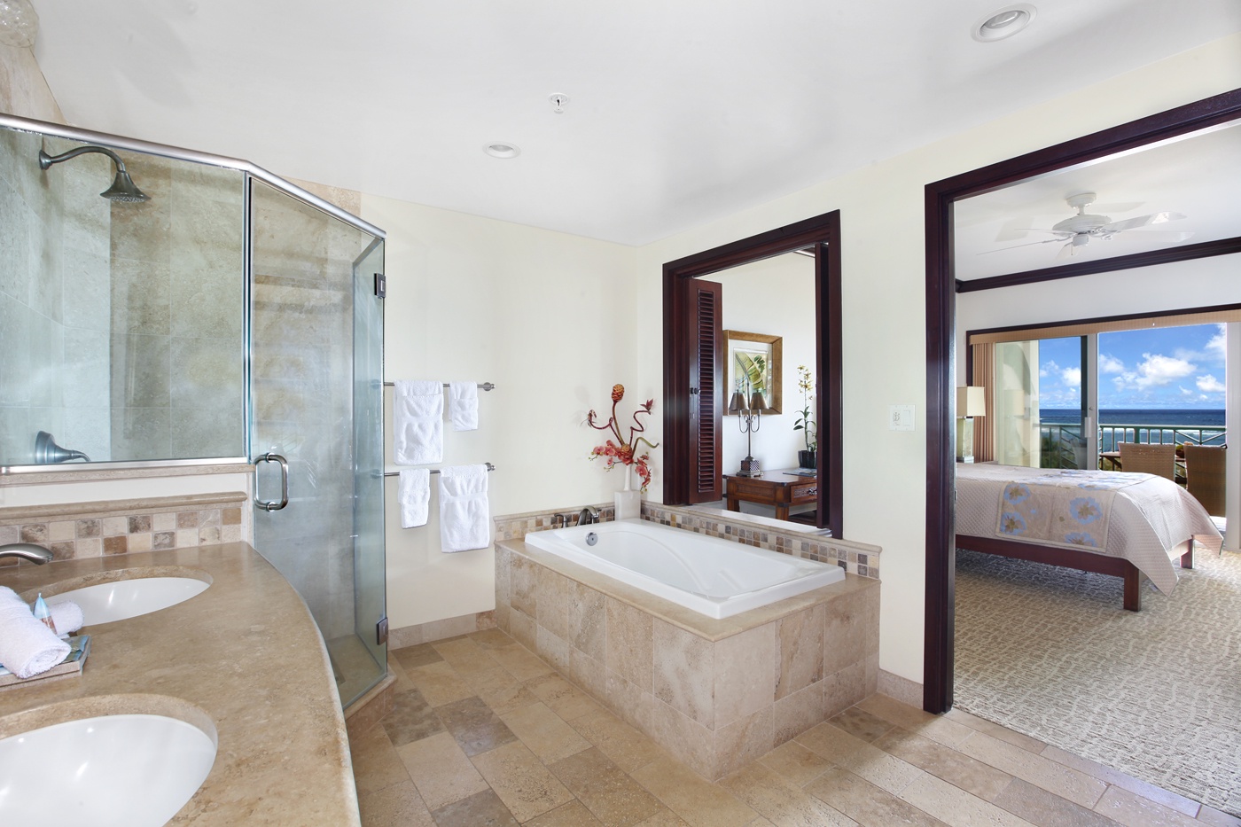 This third-floor suite includes a stately kitchen with a Wolf glass cooktop and oven, Sub-Zero refrigerator, GE profile microwave, Fisher Paykel dual dishwasher drawers, granite counter tops, African Mahogany cabinets, along with three full bathrooms surrounded with Peruvian Travertine stone. Enjoy the clean design and convenient location, with the beach and countless Kaua’i adventures just steps from your oceanfront suite.