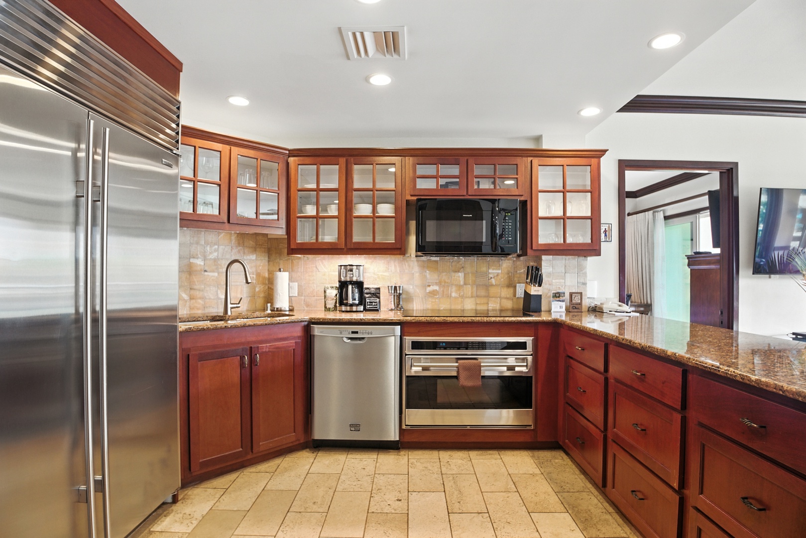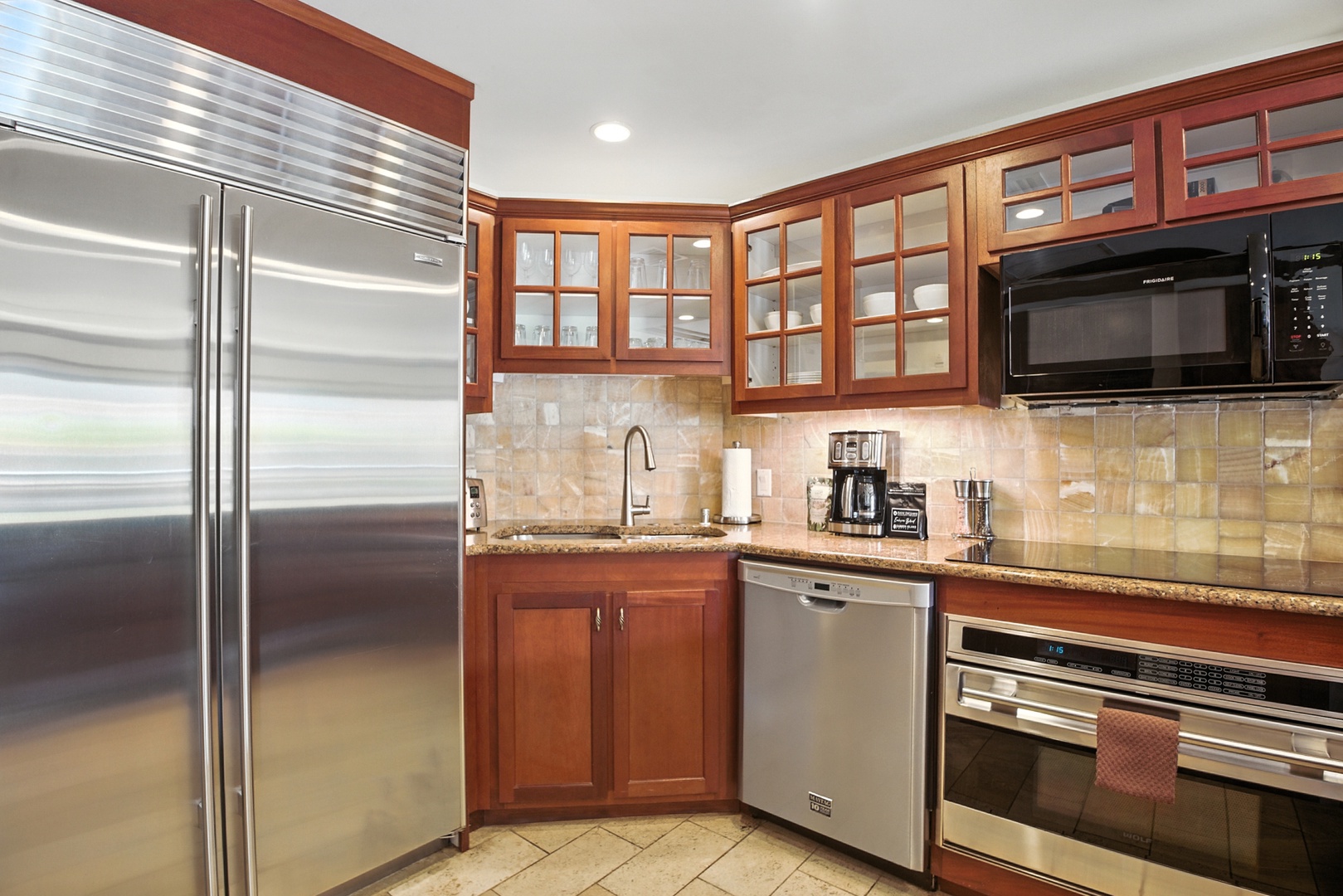 The stylish interior is furnished with solid collectable hardwood pieces by renowned interior designer Philpot's and Associates, complimented by the Merbau hardwood crown molding and doors throughout. The stately kitchen has a Wolf glass cooktop and oven, Sub-Zero refrigerator, GE profile microwave, Fisher Paykel dual dishwasher drawers, granite counter tops, African Mahogany cabinets, along with three full bathrooms surrounded with Peruvian Travertine stone. Enjoy the clean design and convenient location, with the beach and countless Kaua’i adventures just steps from your front door.