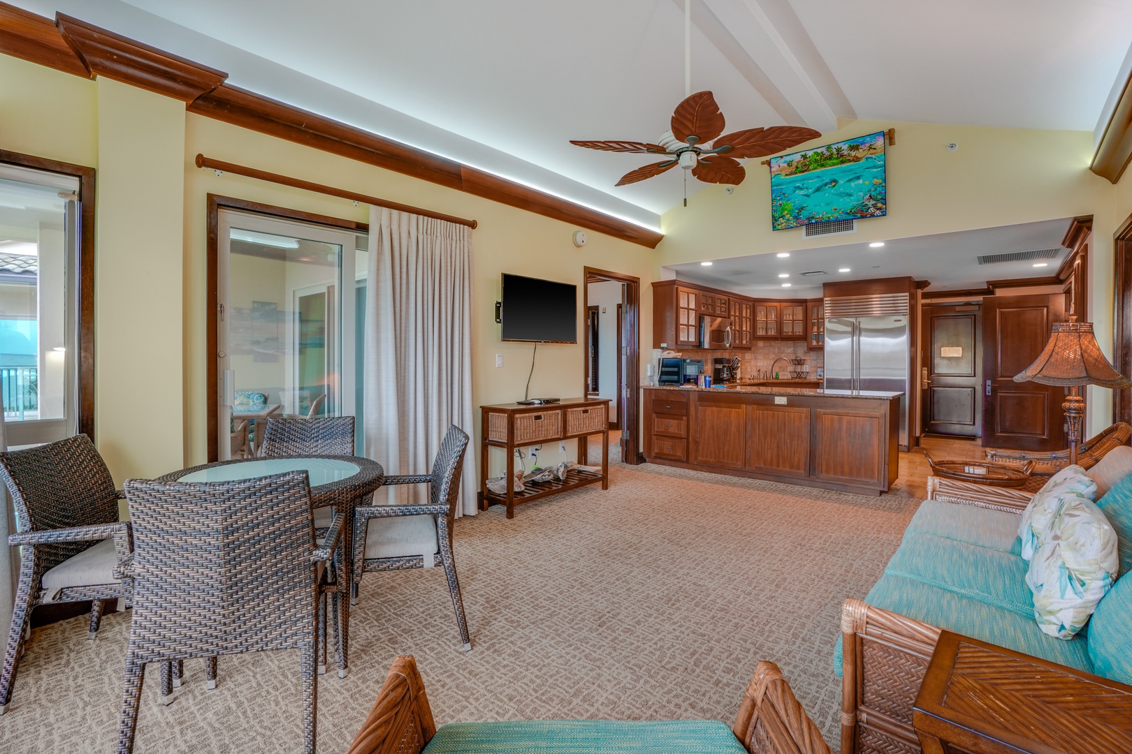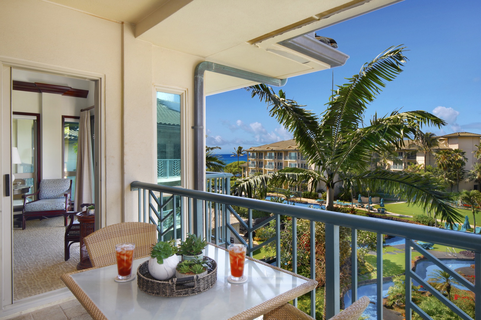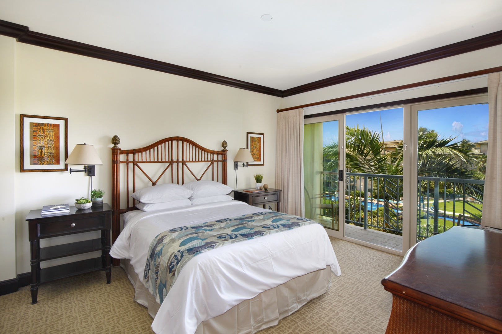 One of Waipouli Beach Resort’s best ocean and pool view penthouses, this fourth-floor suite fronts the torch-lit interior courtyard and pool. C402 is a two-bedroom, three-bath suite that has a king bed as well as a queen bed. In addition to this, the living room has a sleeper sofa, easily accommodating up to six people. With impressive interior views of the cascading tropical pool, you can also enjoy fresh sea breezes and sunrises from your private lanai.