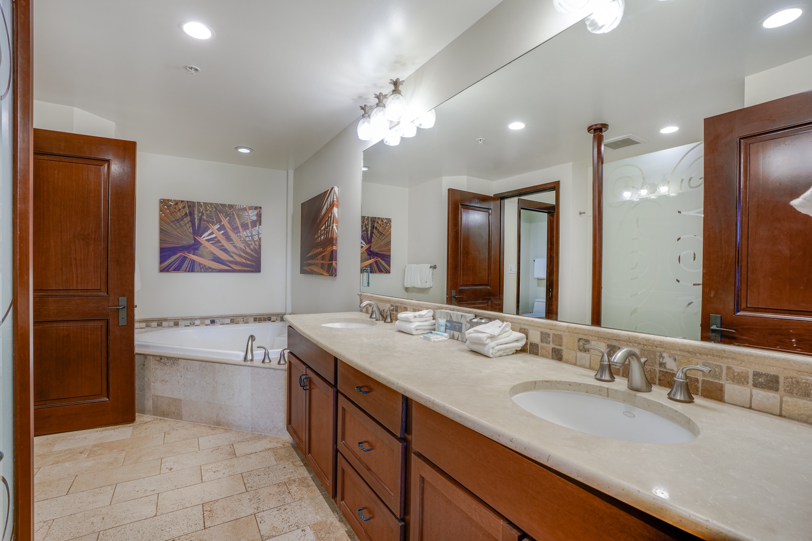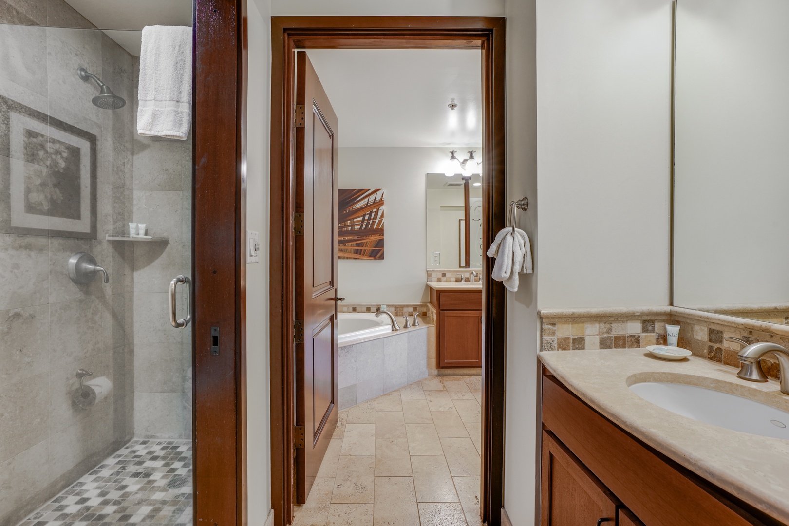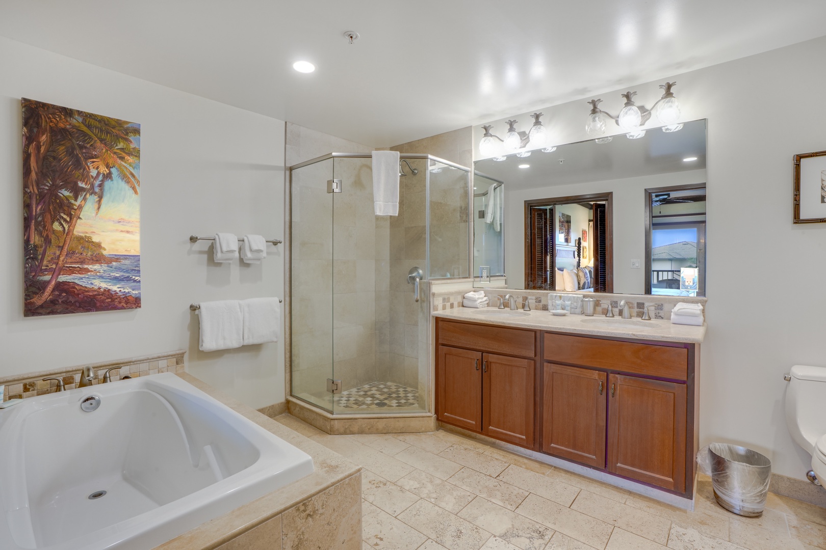 The stylish interior is furnished with solid collectable hardwood pieces by renowned interior designer Philpot's and Associates, complemented by the Merbau hardwood crown molding and doors throughout. The stately kitchen has a Wolf glass cooktop and oven, Sub-Zero refrigerator, GE Profile microwave, Fisher Paykel dual dishwasher drawers, granite countertops, African Mahogany cabinets, and three full bathrooms surrounded by Peruvian Travertine stone. Enjoy the clean design and convenient location, with the beach and countless Kaua’i adventures just steps from your front door.