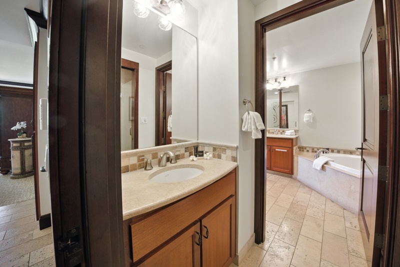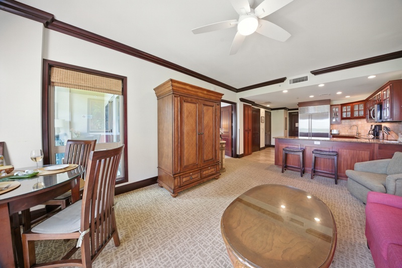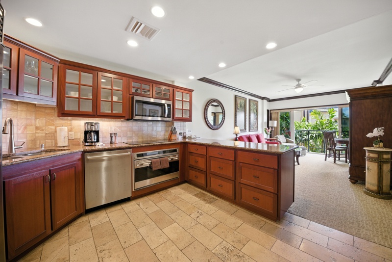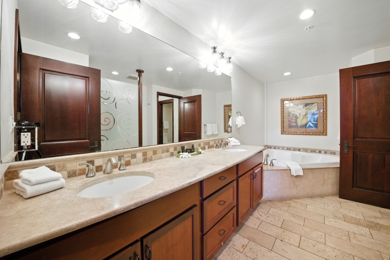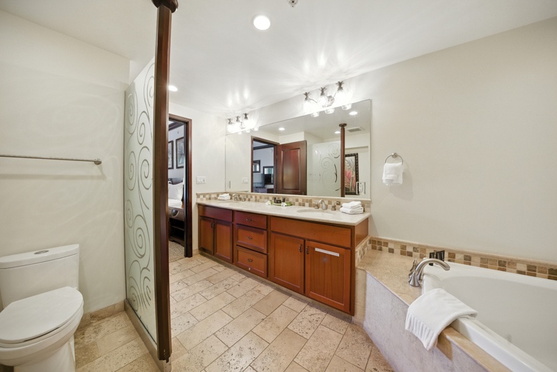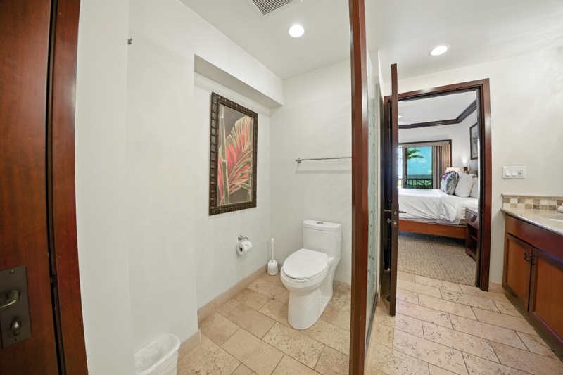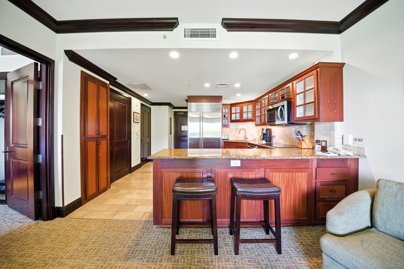 This one King bedroom, third-floor suite includes a stately kitchen with a Wolf glass cooktop and oven, Sub-Zero refrigerator, GE profile microwave, Fisher Paykel dual dishwasher drawers, granite counter tops, African Mahogany cabinets, along with one full bathroom with a jacuzzi tub, and 1 2/3 bathroom with a shower.sink, and toilet, surrounded with Peruvian Travertine stone. Enjoy the clean design and convenient location, with the beach and countless Kaua’i adventures just steps from your ocean view suite.