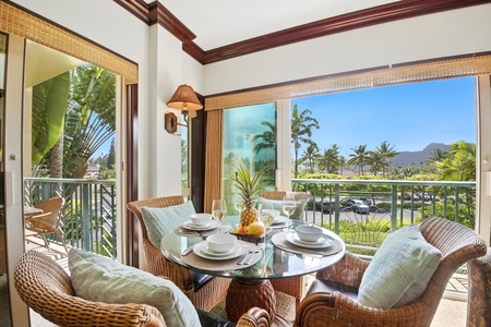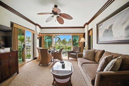 Featuring two king master suites and one queen sleeper sofa, F303 comfortably accommodates up to six people. The stylish interior is furnished by renowned interior designer Philpot's and Associates. The stately kitchen has a Wolf glass cooktop and oven, Sub-Zero refrigerator, GE profile microwave, Fisher Paykel dual dishwasher drawers, granite counter tops, African Mahogany cabinets, along with three full bathrooms surrounded with Peruvian Travertine stone. Enjoy the clean design and convenient location, with the beach and countless Kaua’i adventures just steps from your front door.