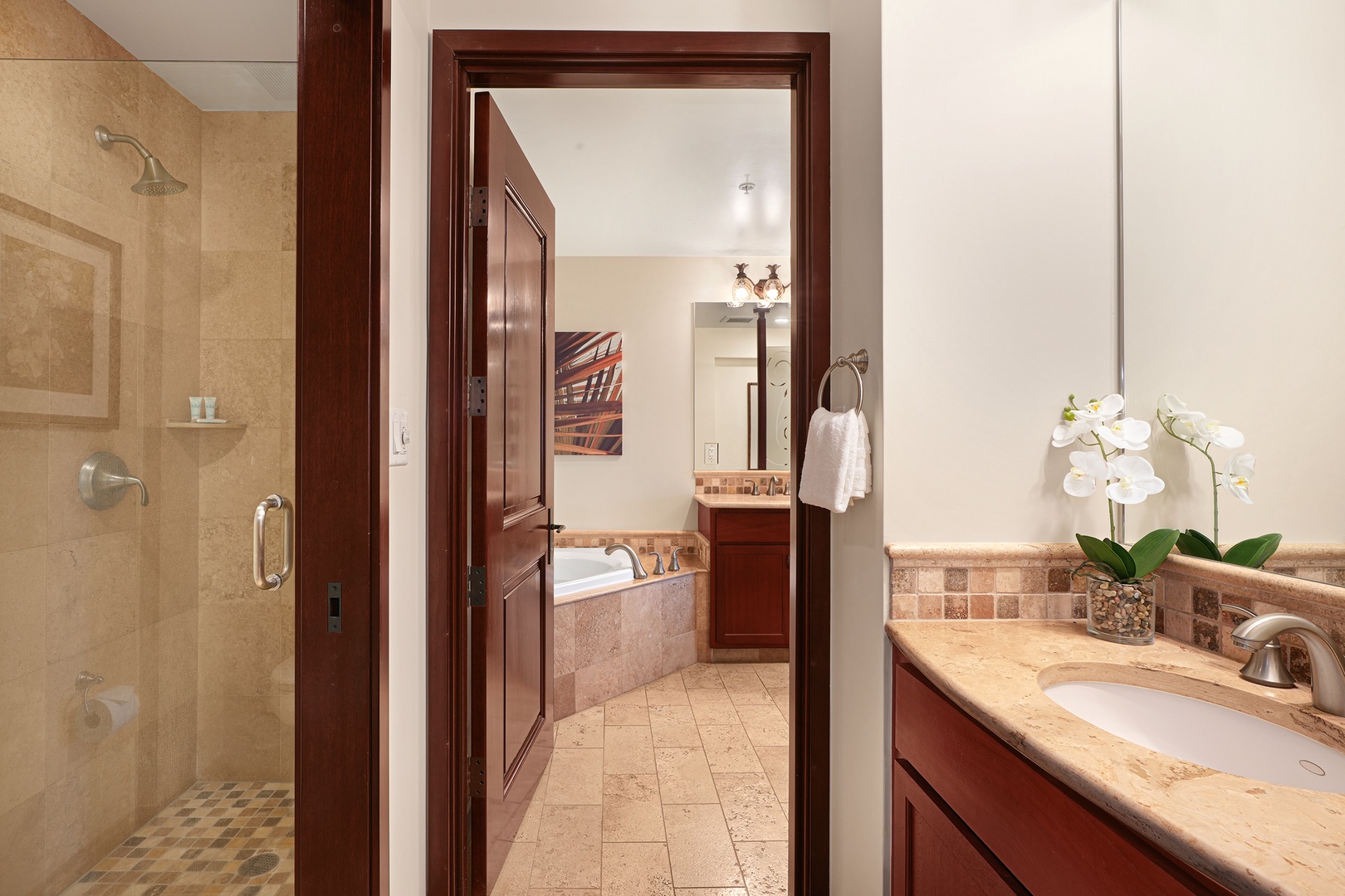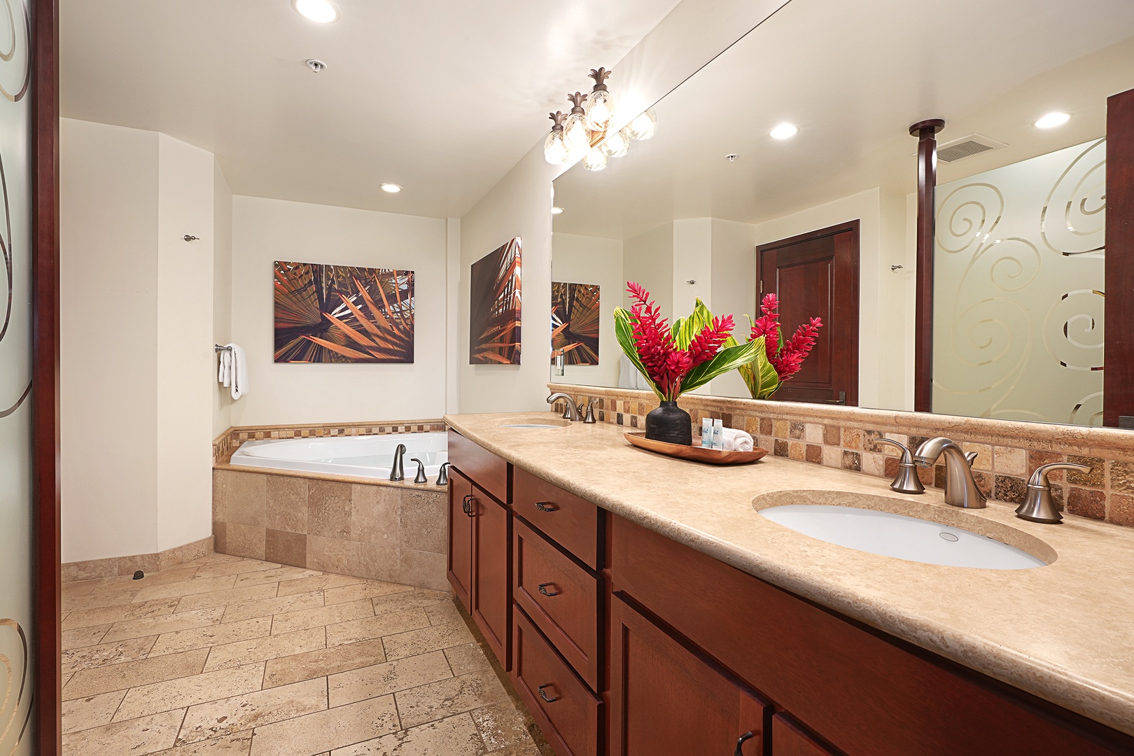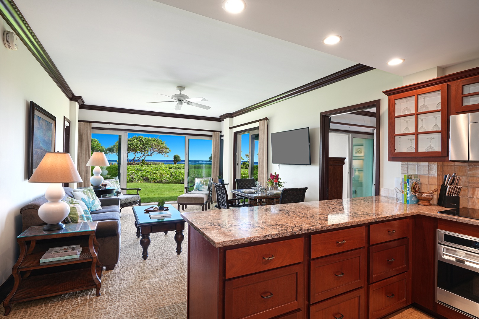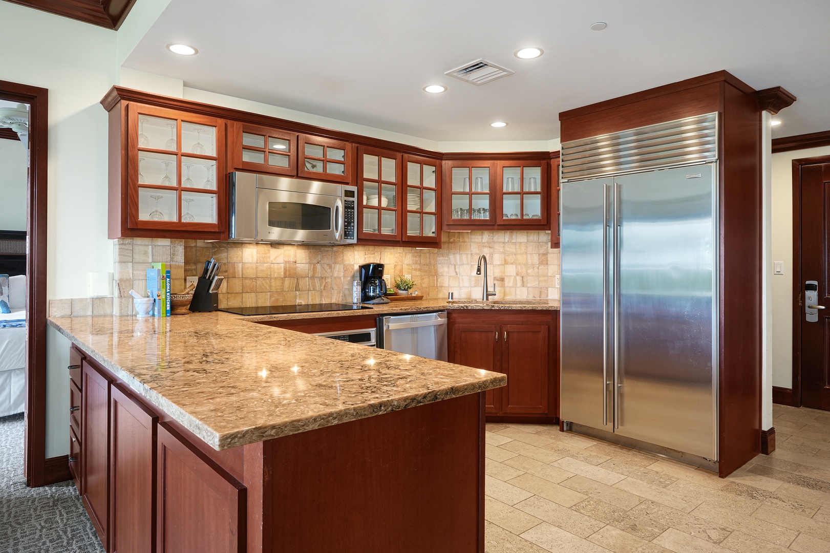 The stylish interior of Waipouli Beach Resort G106 includes a stately kitchen with a Wolf glass cook-top and oven, Sub-Zero refrigerator, granite counter tops as well as African Mahogany cabinets. The three bathrooms have Peruvian Travertine stone surrounding two soaking tubs