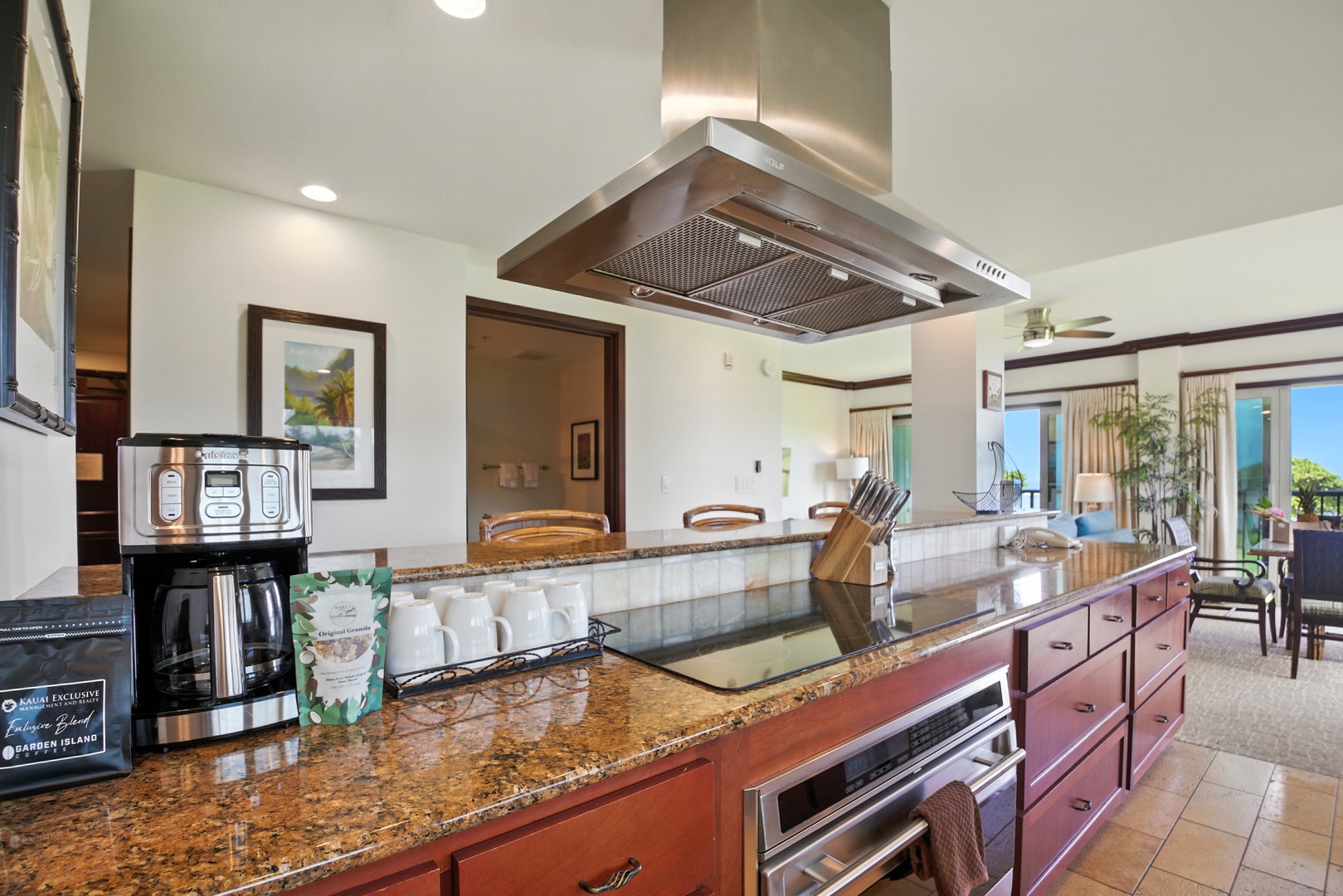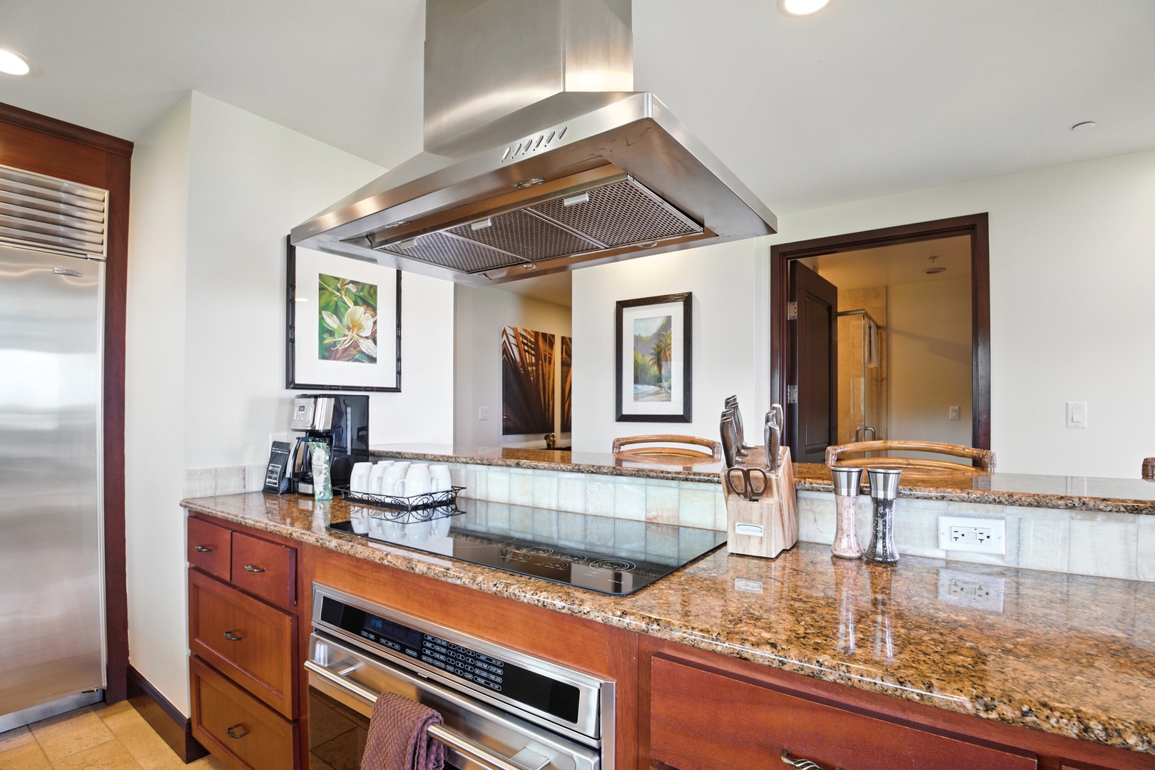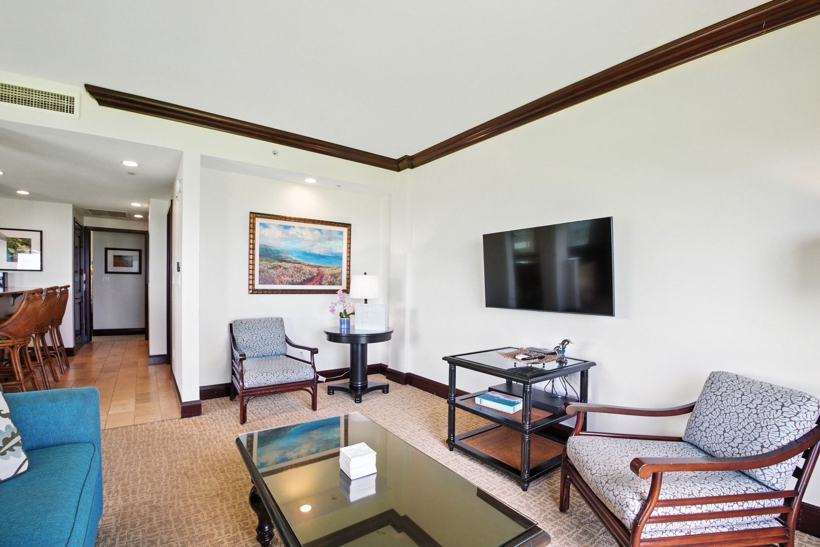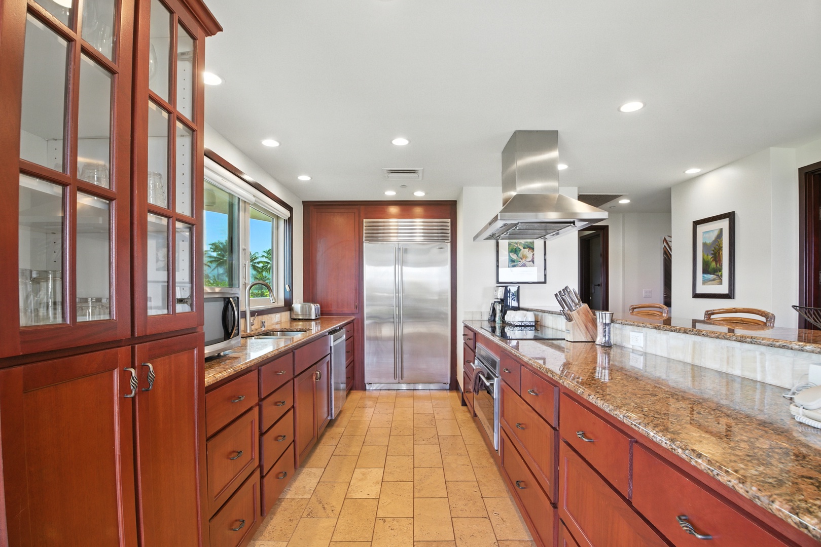 Featuring a king bed, a queen bed and a queen sleeper sofa, this suite can comfortably accommodate six people. The stylish interior is furnished by renowned interior designer Philpot's and Associates. The stately kitchen has a Wolf glass cooktop and oven, Sub-Zero refrigerator, GE profile microwave, Fisher Paykel dual dishwasher drawers, granite counter tops, African Mahogany cabinets, along with three full bathrooms surrounded with Peruvian Travertine stone. Enjoy the clean design and convenient location, with the beach and countless Kaua’i adventures just steps from your front door.