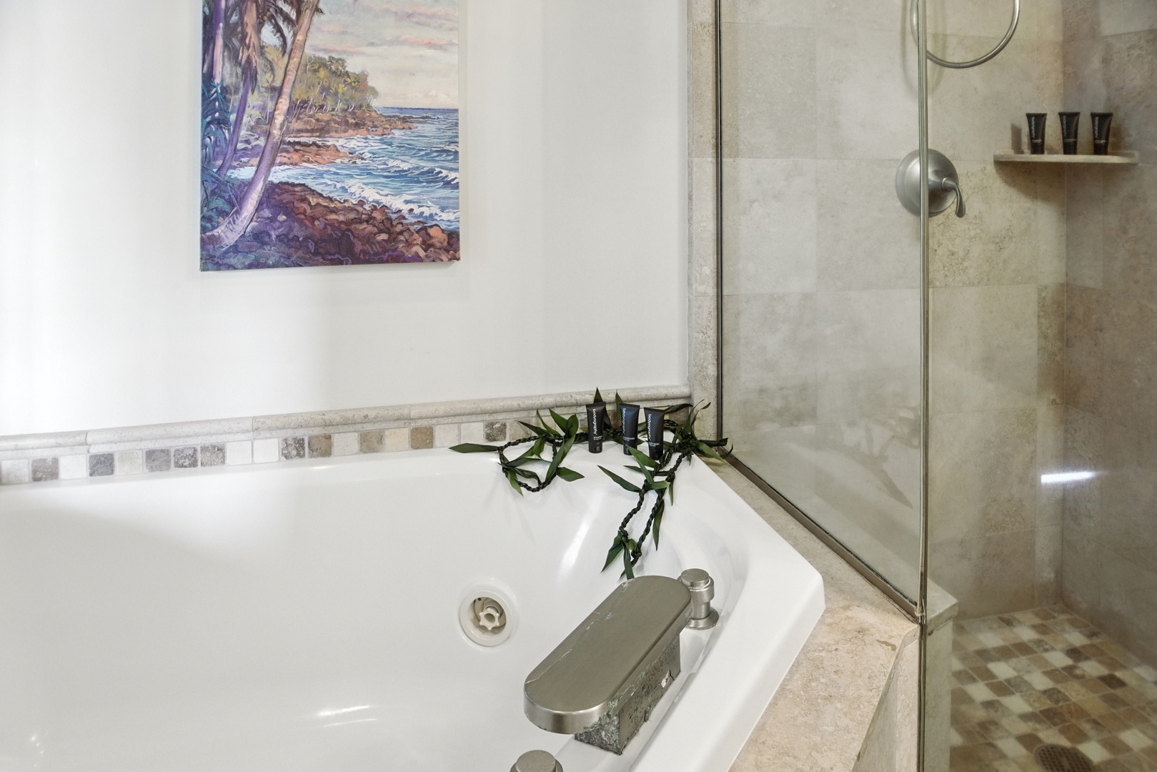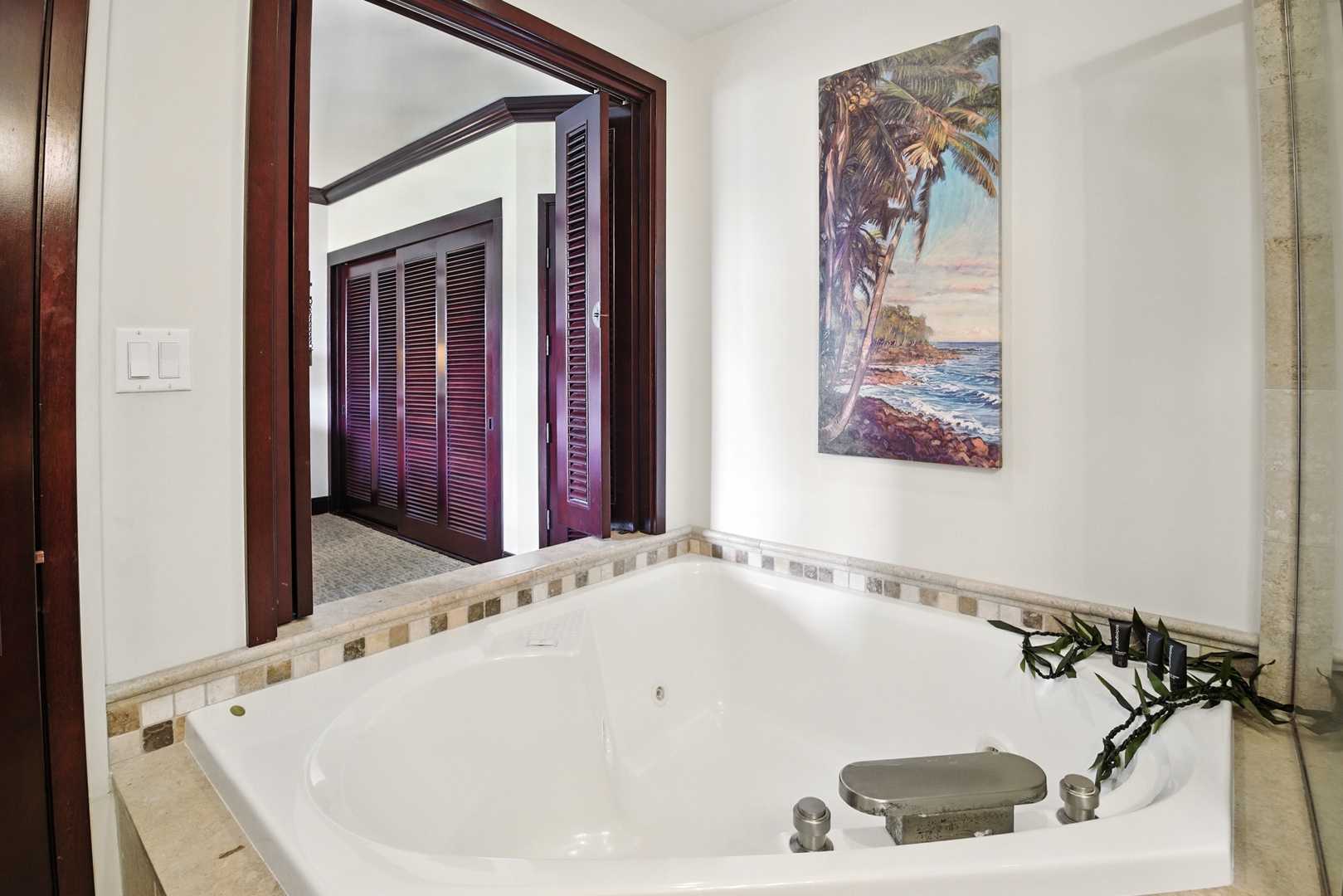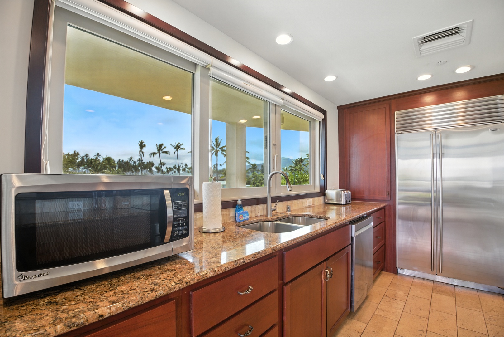 Featuring a king bed, a queen bed and a queen sleeper sofa, this suite can comfortably accommodate six people. The stylish interior is furnished by renowned interior designer Philpot's and Associates. The stately kitchen has a Wolf glass cooktop and oven, Sub-Zero refrigerator, GE profile microwave, Fisher Paykel dual dishwasher drawers, granite counter tops, African Mahogany cabinets, along with three full bathrooms surrounded with Peruvian Travertine stone. Enjoy the clean design and convenient location, with the beach and countless Kaua’i adventures just steps from your front door.