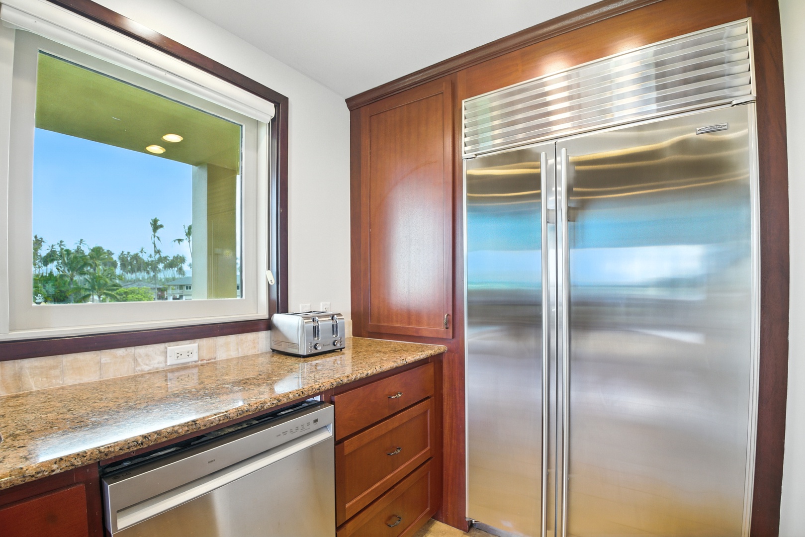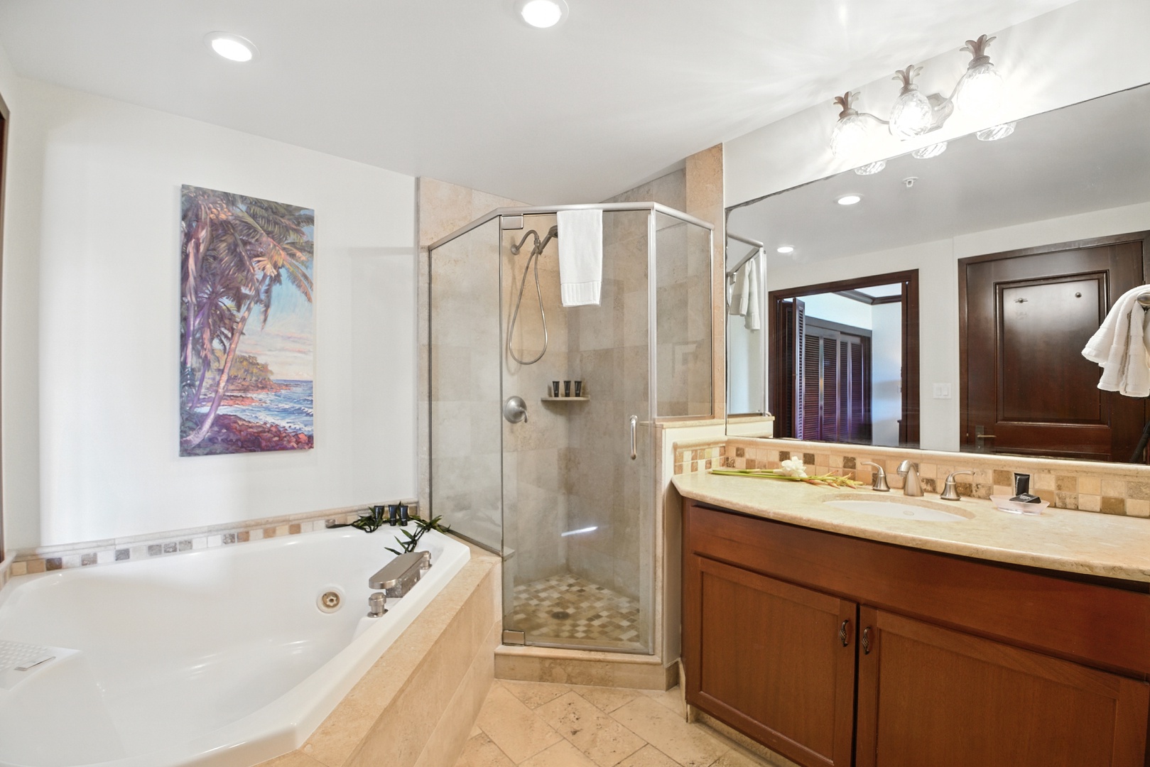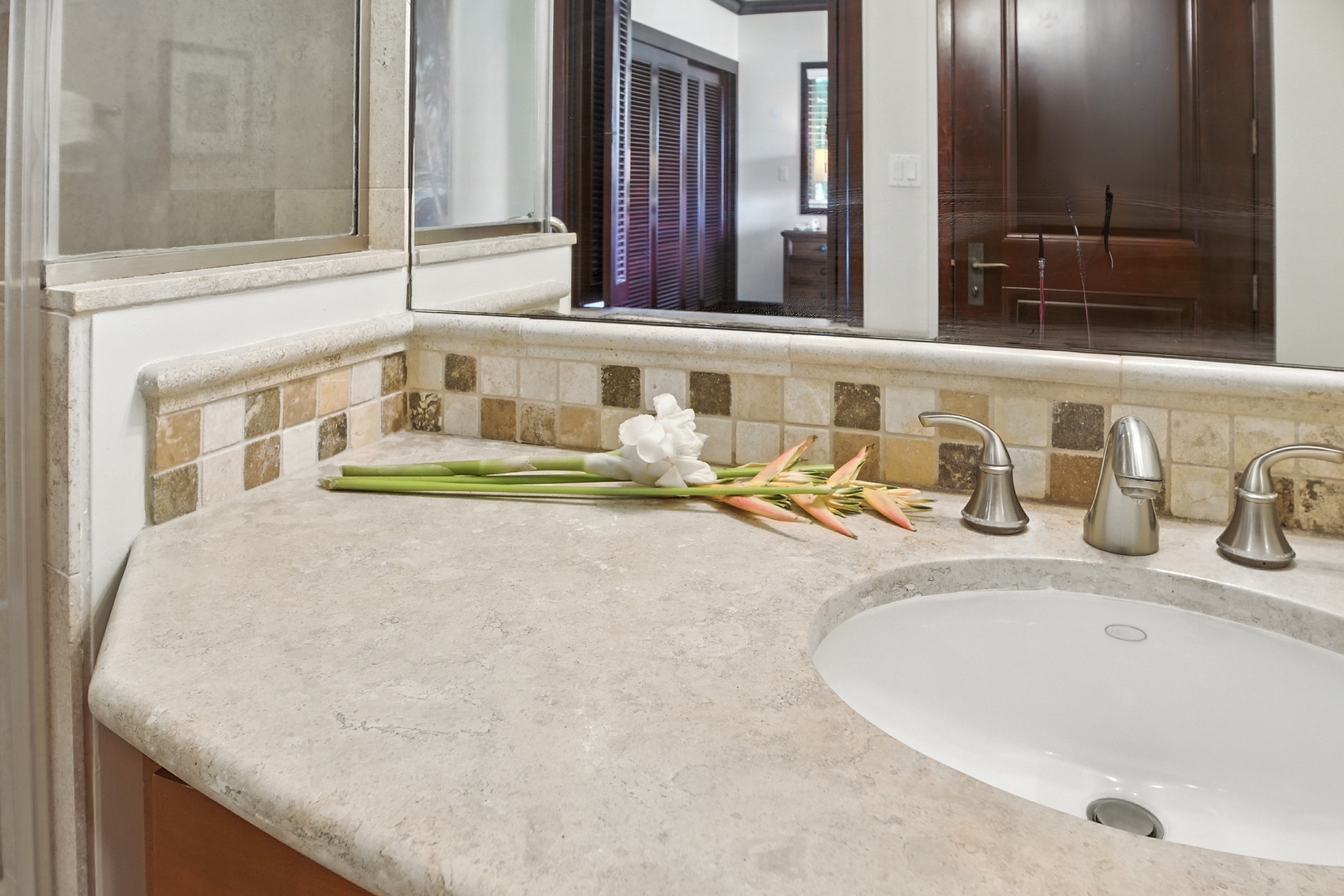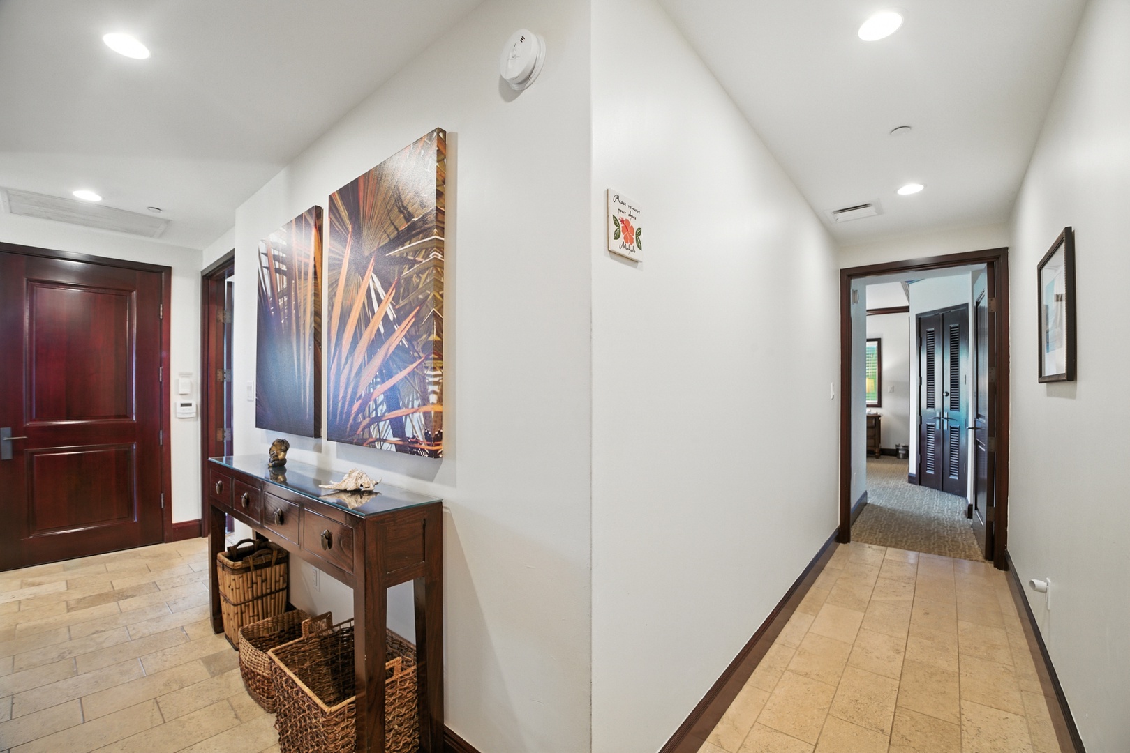 Featuring a king bed, a queen bed and a queen sleeper sofa, this suite can comfortably accommodate six people. The stylish interior is furnished by renowned interior designer Philpot's and Associates. The stately kitchen has a Wolf glass cooktop and oven, Sub-Zero refrigerator, GE profile microwave, Fisher Paykel dual dishwasher drawers, granite counter tops, African Mahogany cabinets, along with three full bathrooms surrounded with Peruvian Travertine stone. Enjoy the clean design and convenient location, with the beach and countless Kaua’i adventures just steps from your front door.